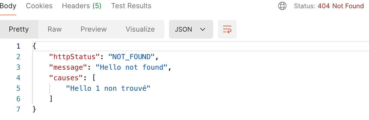 GETétait bien formée et compréhensible, mais que l'entité "Hello" avec l'ID spécifié n'existe pas dans la base de données. En renvoyant un code 404, nous informons clairement le client que la ressource qu'il cherche n'existe pas, ce qui est plus précis et utile que de renvoyer une erreur générique ou de laisser le client deviner la cause de l'absence de réponse.