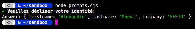 La seconde manière est utiliser la méthode prompt. Cette méthode accepte une ou plusieurs questions sous forme de liste. On peut ainsi combiner les trois prompts et avoir l'objet answer contenant toutes les entrées de l'utilisateur.