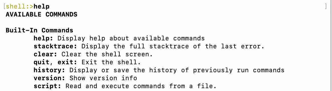 logging.level.root=WARNspring.main.web-application-type=none: on indique que ce n’est pas une application web — démarrage plus léger, pas de serveur embarqué.spring.shell.interactive.enabled=true: active le mode interactif (REPL).spring.main.log-startup-info=falseetlogging.level.root=WARN: règles de logging pour garder la console propre lors de l’utilisation du shell.