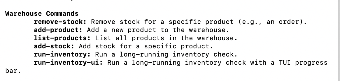 En tapant help dans notre terminal nous aurons une nouvelle section Warehouse Commands qui apparaitra qui contiendra l'ensemble des commandes définies dans cette classe.
