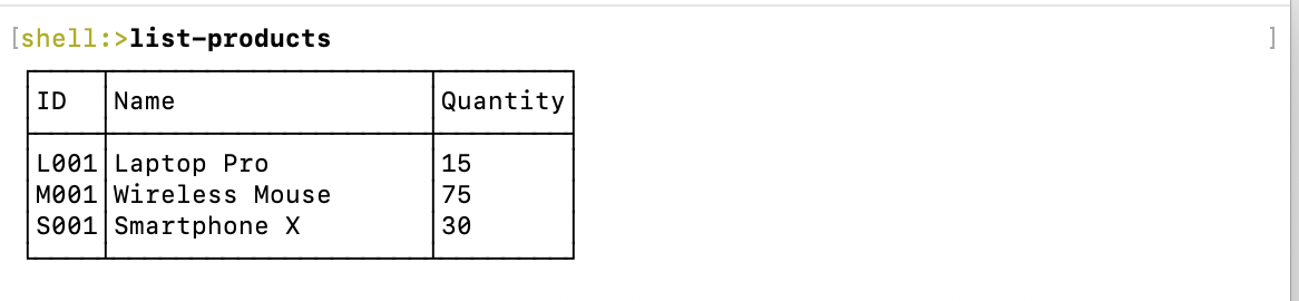 }Ici, Spring Shell permet de créer un tableau formaté grâce aux utilitaires TableModel et TableBuilder. Les colonnes sont définies explicitement, et la largeur de la colonne Name est contrainte pour une meilleure lisibilité.
