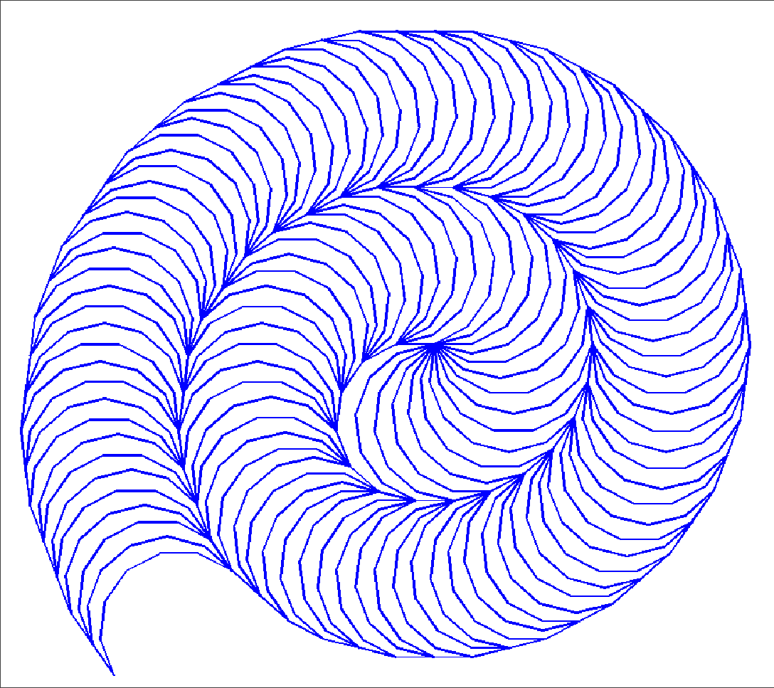 Pour ceux qui se demandent à quoi ressemble une grille à une dimensions, voici probablement la plus connue qui soit composée de cellules identiques à 13 côtés. Le petit nom de cette figure est "One-armed spiral of a reflexed tridecagon" ou spirale à un bras de tridécagones reflétés. L'image est prise de l'article "Voderberg Deconstructed & Triangle Substitution Tiling" de Cye H. Waldman (2014).