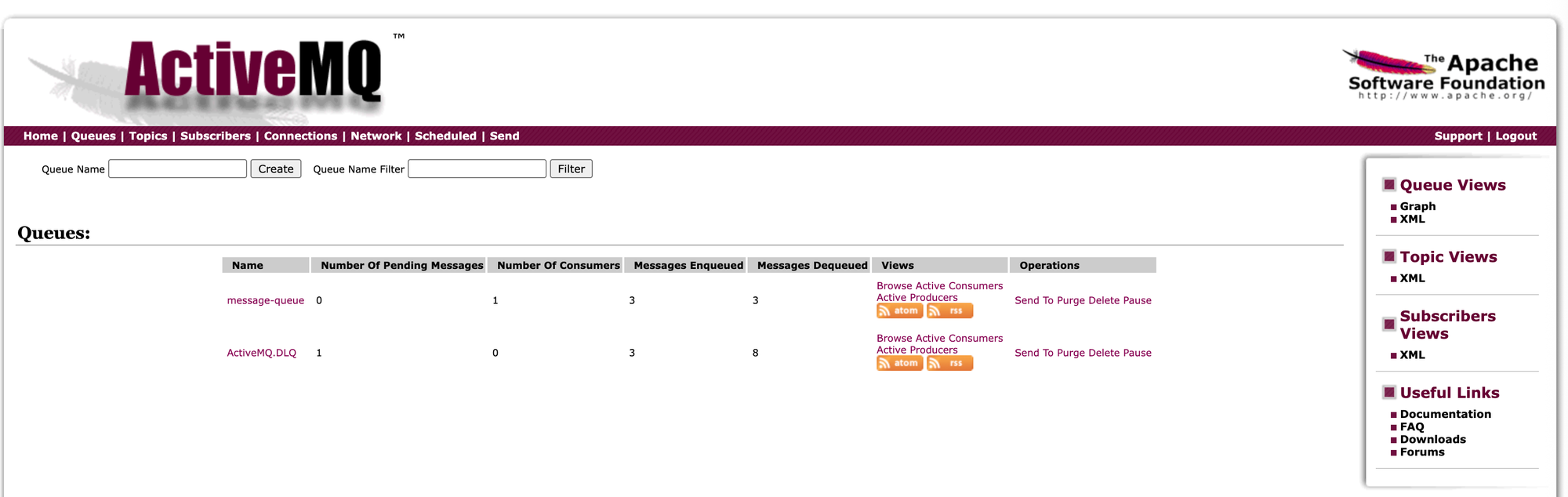 Dans le cadre de cet exemple, mon broker ActiveMQ est lancé dans un conteneur docker, ce dernier me permet d'avoir accès à une console d'administration à l'adresse suivante : http://localhost:8161/admin/index.jsp