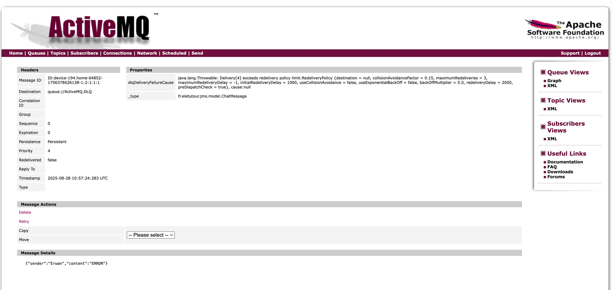 Cette console permet de suivre les différentes queues utilisé ainsi que les message qui y transite, et grâce au message converter, je peux également voir le contenue de ces dernier.