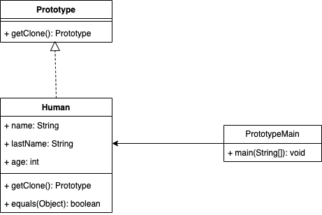Le client de cette classe, au lieu d'écrire du code invoquant directement une nouvelle instance de la classe, appellera la méthode clone() sur le prototype ou utilisera une autre méthode fourni par un autre design pattern.