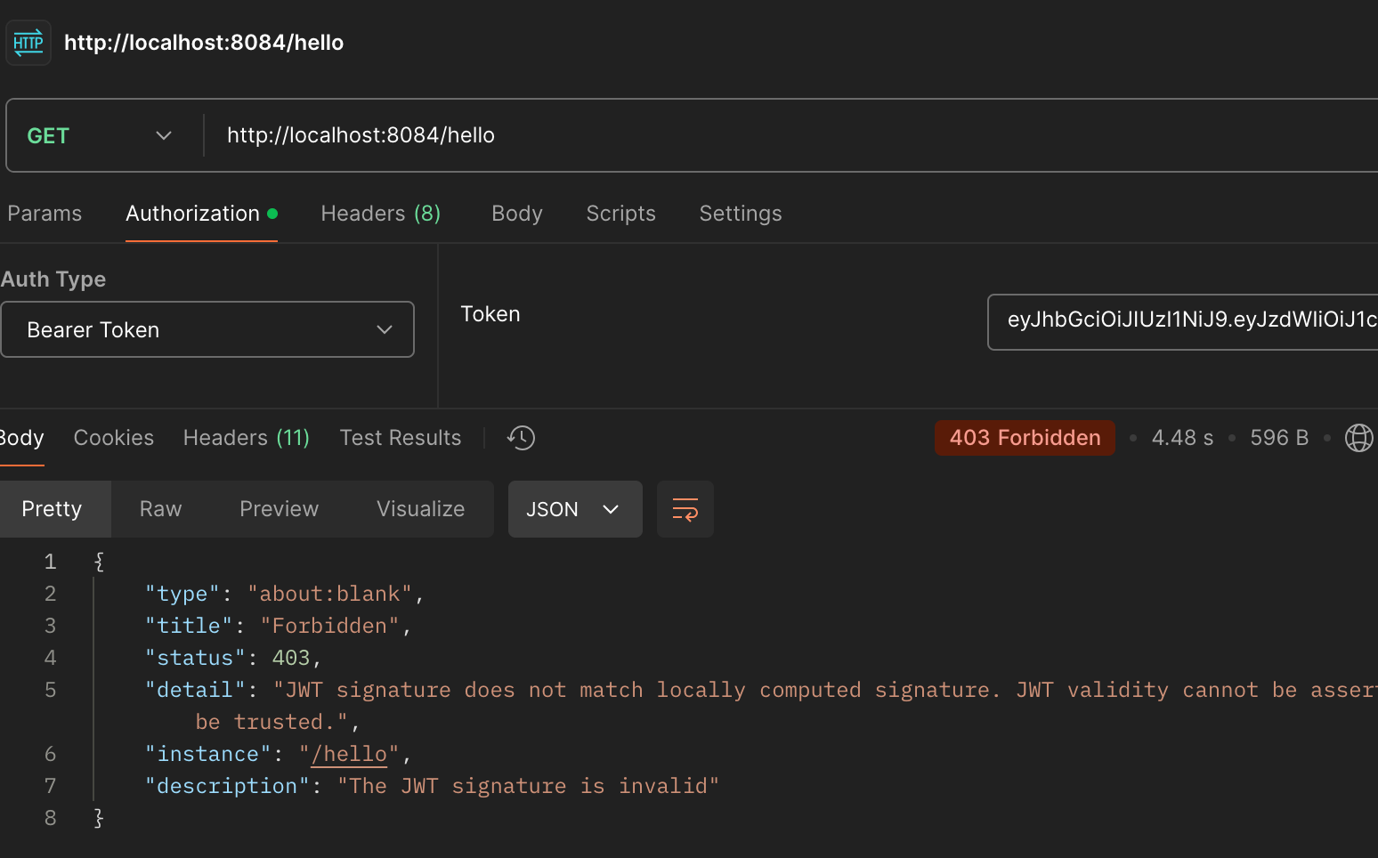 case SignatureException e -> createProblemDetail(403, e.getMessage(), "The JWT signature is invalid");