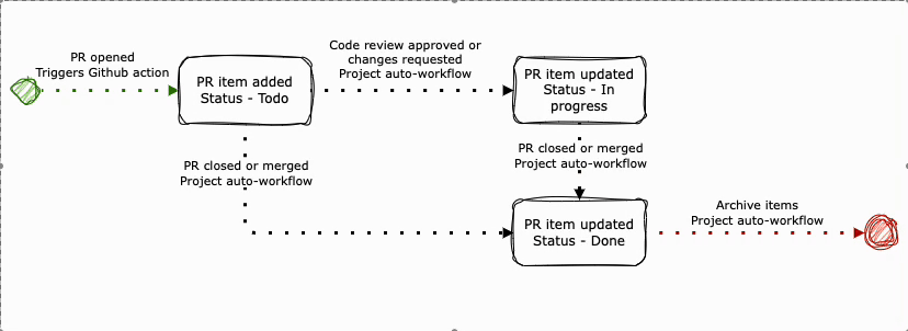 L'architecture que nous proposons repose sur un principe simple : l'automatisation événementielle. Chaque action significative sur une Pull Request (création, mise à jour, merge, etc.) déclenche un workflow GitHub Actions qui se charge de synchroniser l'information avec le Project View centralisé. L'exemple proposé permet de simplement ajouter une nouvelle PR au projet lorsqu'elle est ouverte. La bascule à DONE lorsqu'elle est fusionnée est automatique grace aux workflows.