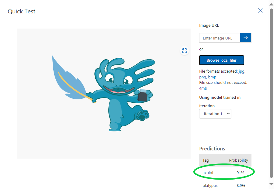 On importe la première image, notre mascotte Axo. Le modèle estime avec une probabilité de 91 % que l'image est un axolotl.