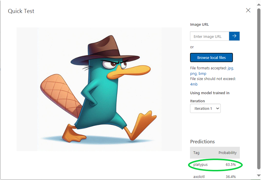 On fait la même chose pour la deuxième image de test et le modèle arrive à prédire correctement qu'il s'agit d'un ornithorynque avec une probabilité de 63,5 %.