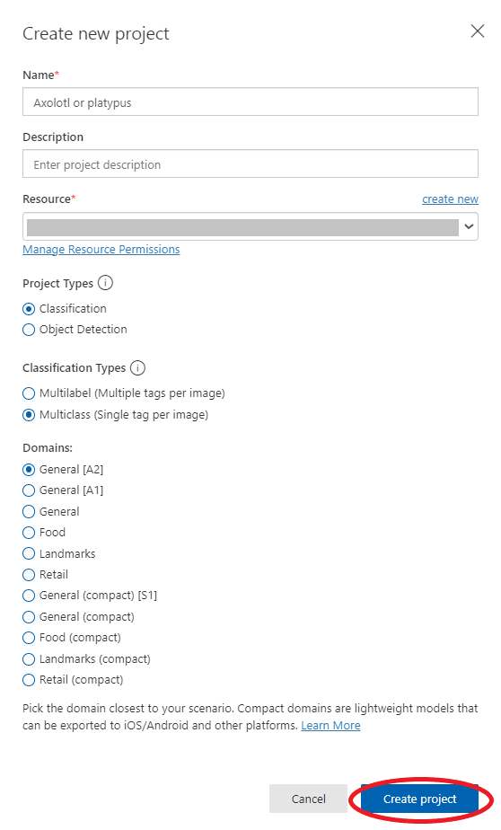 Ensuite, on attribue un nom au projet et la ressource d'entraînement qu'on avait créé auparavant. Le type de projet est de classification. Ce genre de projets sert à faire la distinction parmi différentes images en leur attribuant un ou plusieurs labels. Par contre, les projets du type détection d'objets sont utiles à trouver l'emplacement d'une chose spécifique dans une image (ce qui n'est pas d'intérêt pour ce projet).