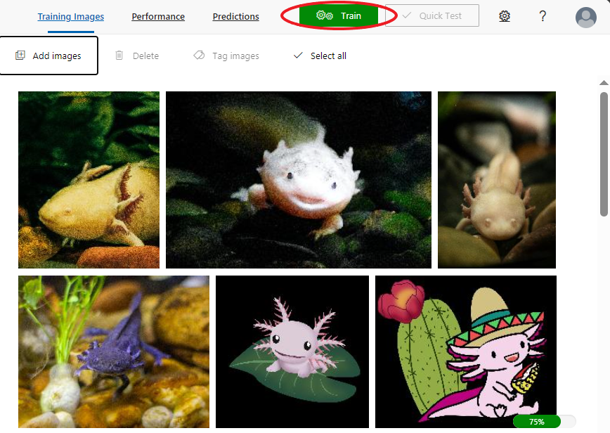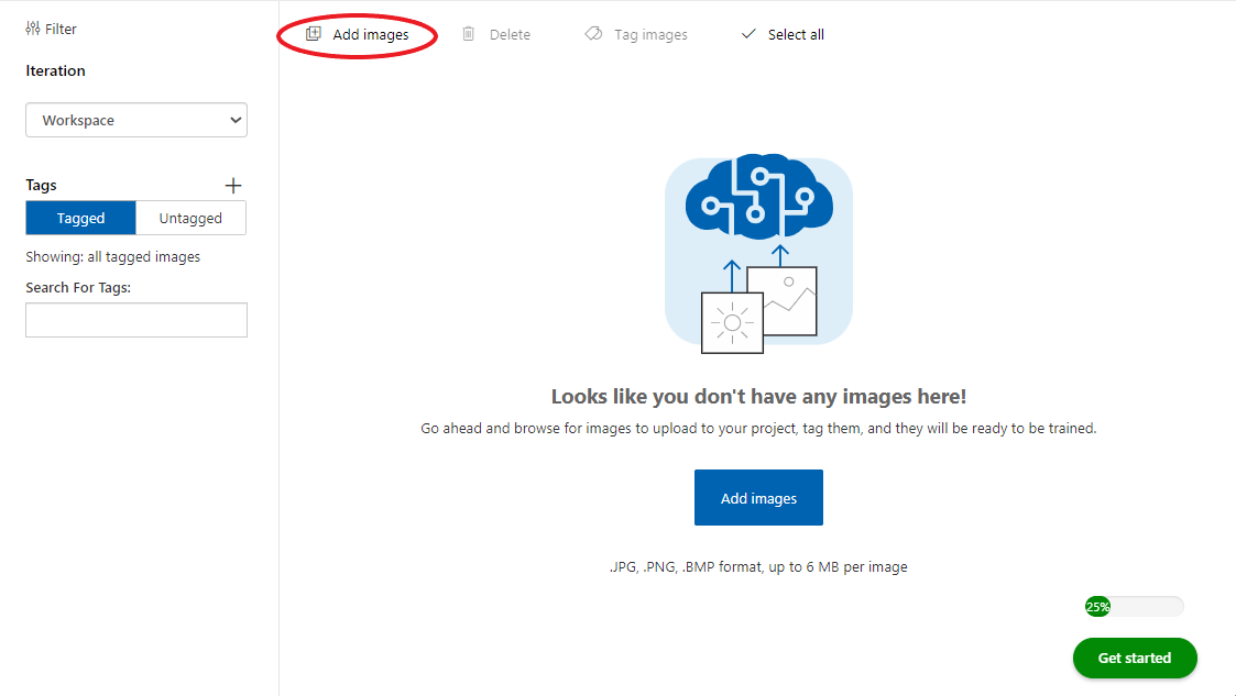 Il faut maintenant ajouter les images qui serviront à entraîner le modèle. Pour cela faire, il n'y a qu'à cliquer sur « Add images ».
