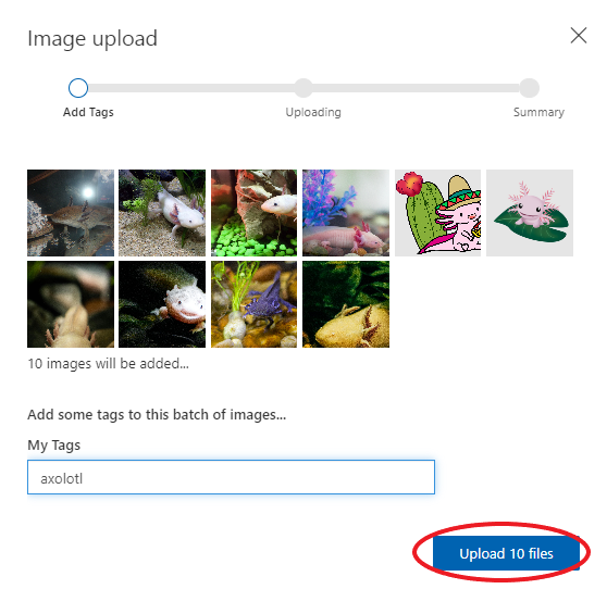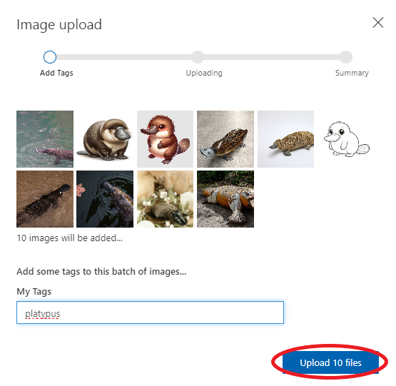 On commence d'abord par les images des ornithorynques. Une fois qu'elles sont importées, il faut les attribuer le label ornithorynque (ou platypus en anglais) et on clique sur « Upload images ».