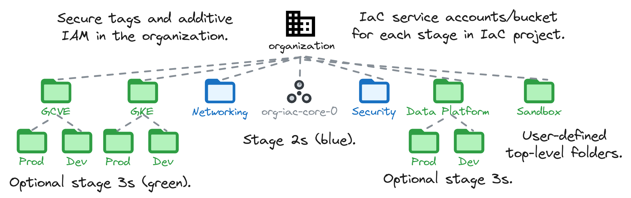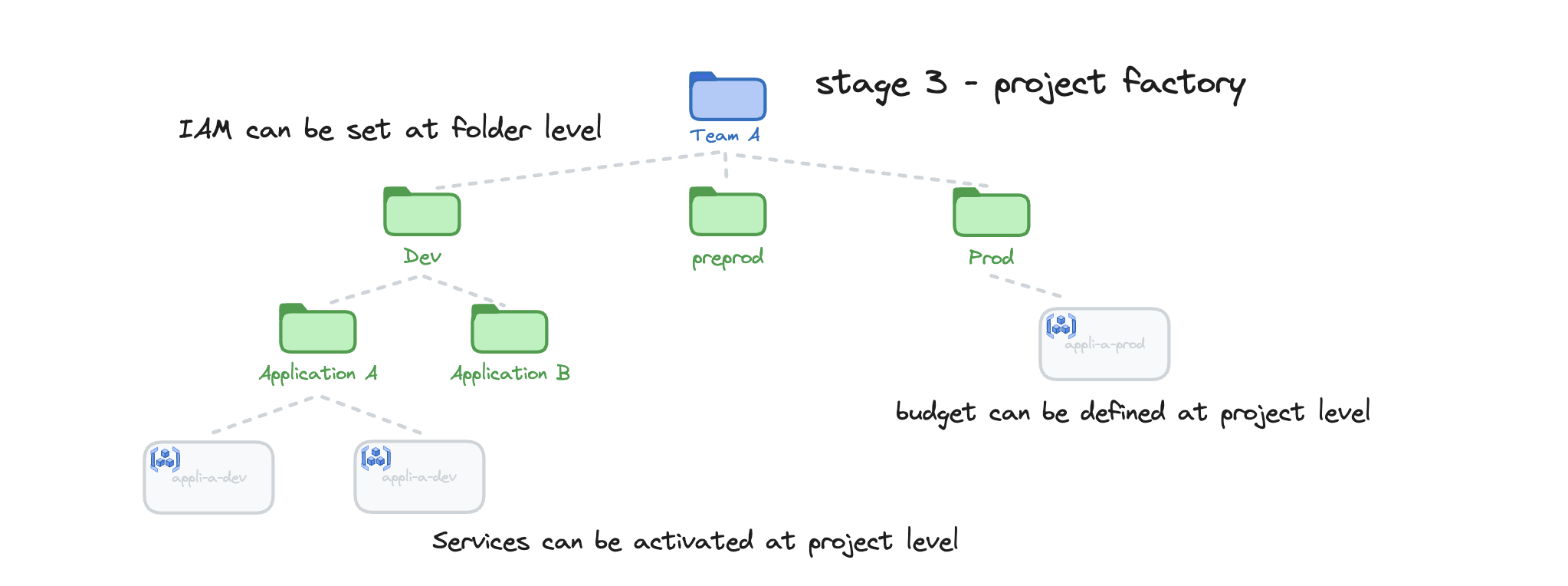 Ce stage permet de créer les dossiers Networking et Security afin de centraliser les projets, de mettre en place la CI/CD pour les stages networking, project factory, ..., de déployer une sandbox, des arborescences "typiques" (data, gke, etc.) ou bien des dossiers de premier niveau.