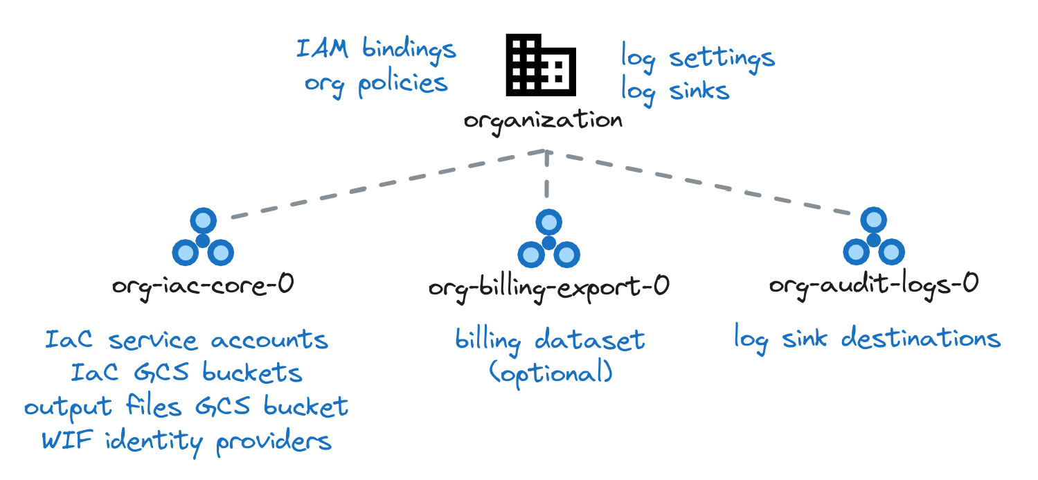- Org policies: Des exemples sont fournis dans le projet, mais cela permet à une organisation de restreindre la création de ressources à une région spécifique. De plus, elle peut limiter les types de VM utilisables ou interdire les adresses IP externes sur celles-ci, par exemple.