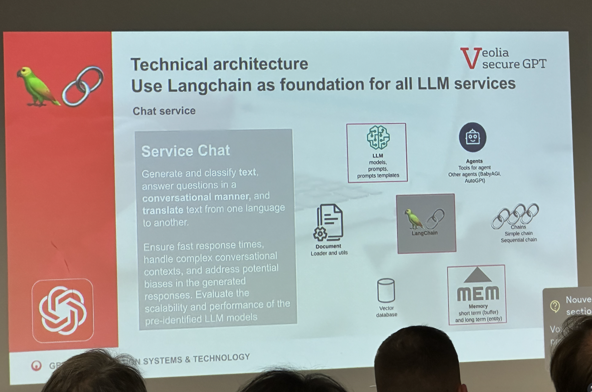Veolia utilise LangChain pour interroger de manière sécurisée toutes ses bases de données. L'architecture s'appuie sur RAG (Retrieval Augmented Generation) pour une efficacité maximale. Les retours des collaborateurs sont intégrés à Veolia Secure GPT pour améliorer continuellement le service.