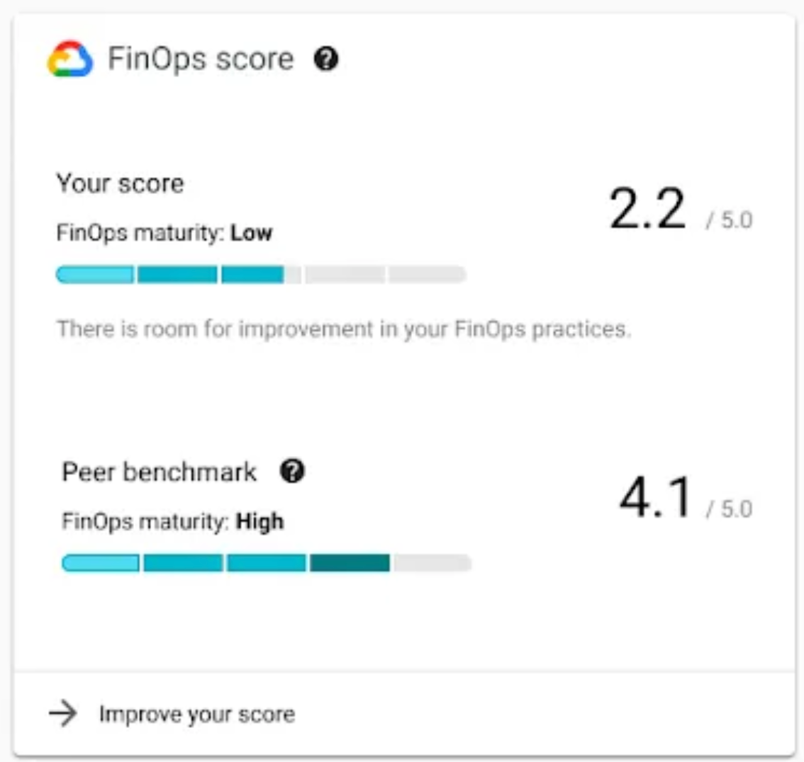La première section de FinOps Hub représente l'évaluation de la maturité FinOps des entreprises. En analysant l’utilisation des services de Google Cloud, FinOps Hub attribue un score de maturité sur une échelle de 0 à 5 reflétant le niveau de maturité de l'entreprise en matière de gestion des coûts cloud.