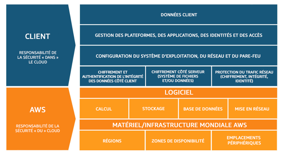 Avant toute chose, il est important de comprendre le concept de responsabilité partagée. La sécurité et la conformité sont une responsabilité partagée entre AWS et le client.