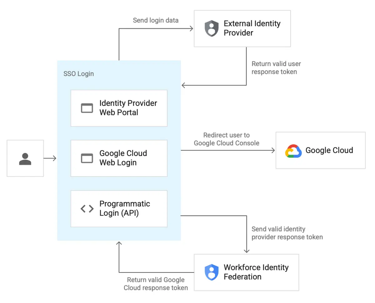 Pour répondre à ces problématiques, GCP propose la fédération d'identités au sens large au travers de Workforce Identity Federation (pour les humains) et Workload Identity Federation (pour les machines). Ces deux services bien intégrés à GCP ont l'avantage de reposer sur les standards SAML et OIDC qui assurent une interopérabilité entre les applications, les fournisseurs d'identité et les clients.