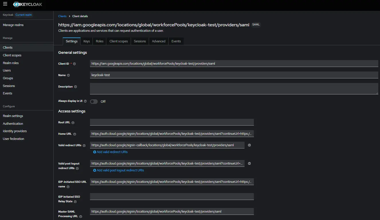 Ensuite, nous définissons un client qui représentera l'instance Workforce Identity Federation de notre landing-zone GCP. Dans cette configuration, nous spécifions le nom de notre pool (keycloak-test), le nom de notre provider (saml) ainsi que l'url de callback qui permettra de rediriger les utilisateurs vers la page de connexion keycloak :