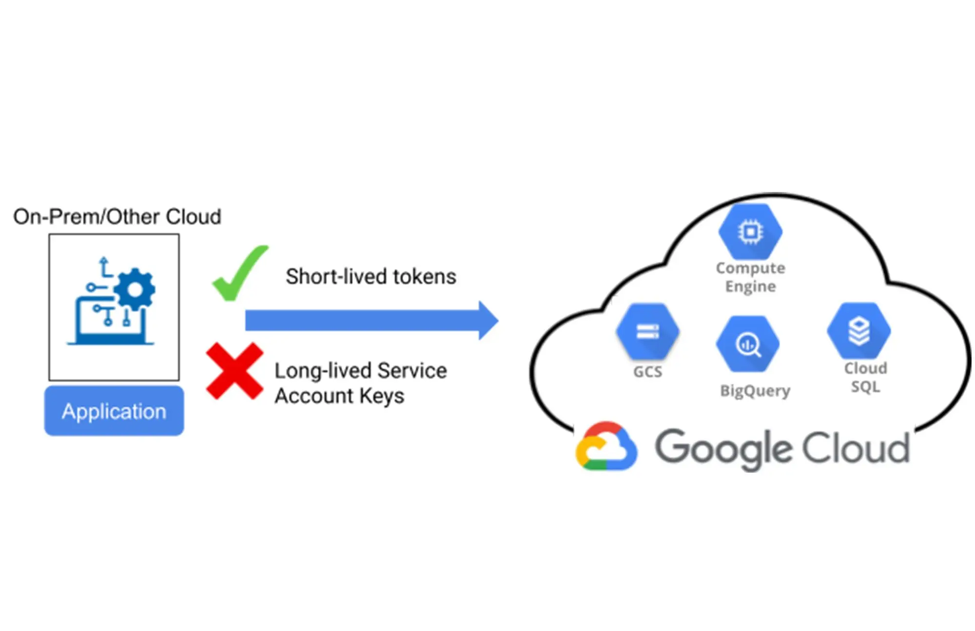 - Les service accounts nécessitent une authentification via des credentials sous forme de clé JSON, contenant une clé privée liée au compte qui est une information sensible. Bien que cette solution soit pratique, il existe une problématique sécurité de gestion de ce secret de connexion : où le stocker, comment le révoquer, comment en effectuer la rotation périodique ?