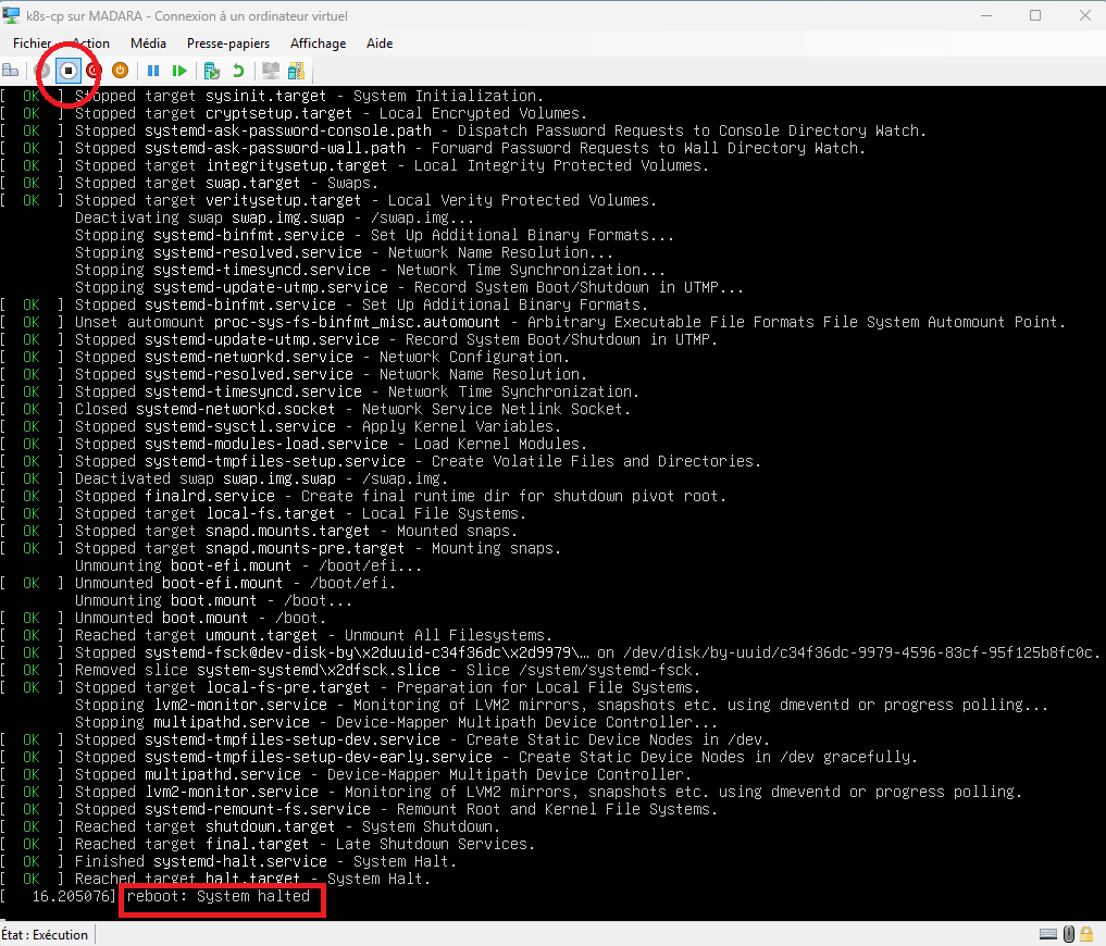 ⚠️ Il arrive souvent que la fonction "Arrêter" de Hyper-V (bouton rouge) ne fonctionne pas correctement, ce qui amène des blocages.