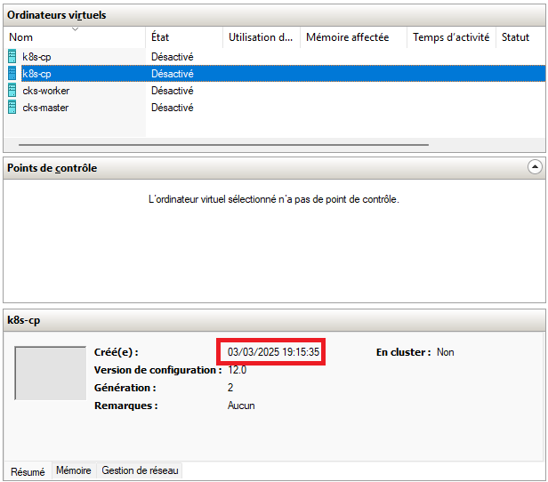 Finalement, démarrez la VM k8s-cp à l'aide du gestionnaire Hyper-V. Vous êtes maintenant prêts à installer les composants du cluster sur vos 2 nouvelles VM 🚀
