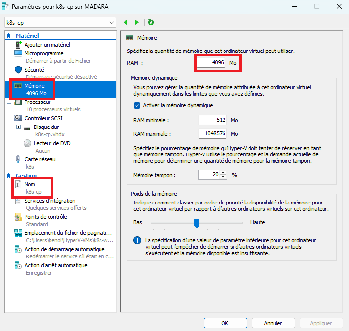 Dans la fenêtre des paramètres, modifiez le nom en "k8s-worker", ainsi que la quantité de mémoire.