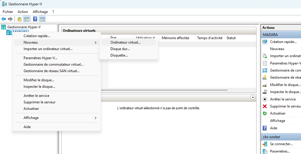 Cliquez avec le bouton droit sur le nom de votre host Hyper-V à gauche puis Nouveau / Ordinateur virtuel.