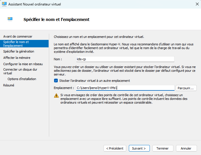Entrez le nom "k8c-cp" pour la machine et éventuellement l'endroit où sont stockées vos VM.
