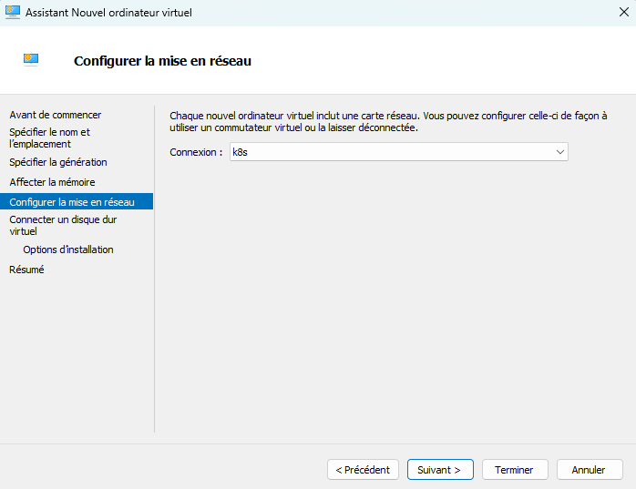 Par la suite, vous devez définir comment est connecté votre VM. Ici, choisissez le switch virtuel créé précédemment: k8s