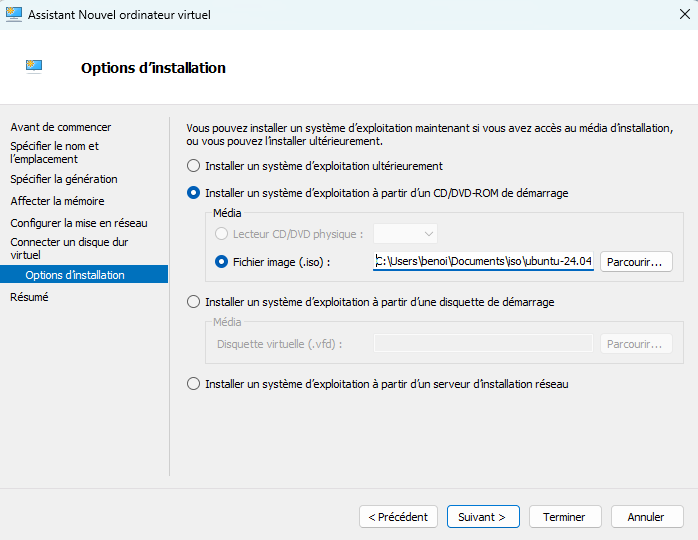 Pour cette étape, j'ai choisi d'installer l'OS Ubuntu 24.02 à partir des ISO officiels. Je n'ai pas trouvé d'images au format VHDX (compatible Hyper-V). De plus, les images VMDK que j'ai trouvées contiennent les couches graphiques, ce qui ne nous est pas utile (sans compter qu'il nous faut un utilitaire pour la convertir).