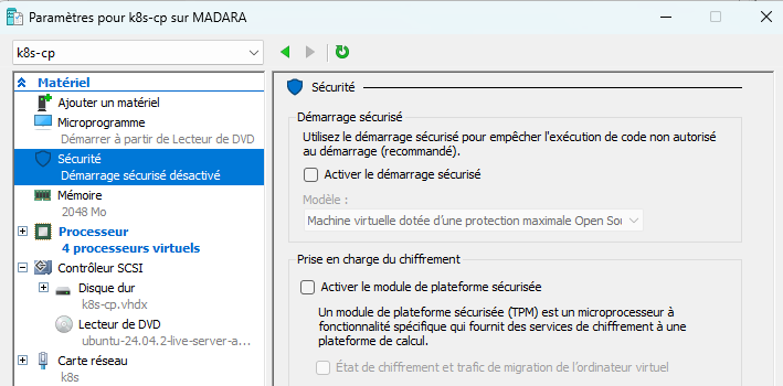 Avant de démarrer la VM, vous devez paramétrer le démarrage sécurisé.