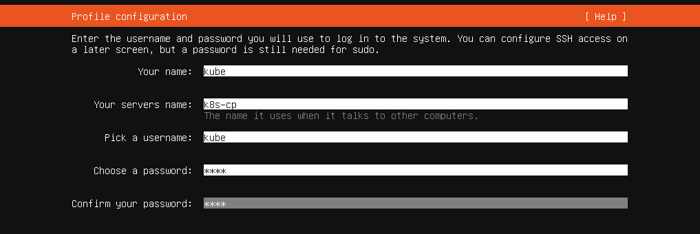 - Renseignez vos noms d'utilisateur et de host, par exemple respectivement "kube" et "k8s-cp"