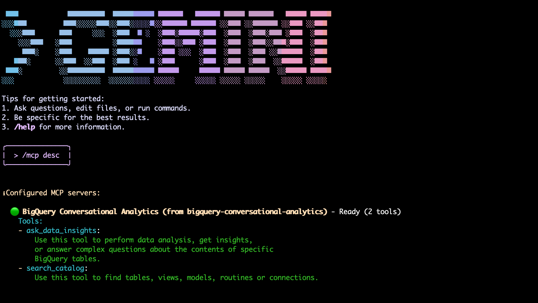 npm install -g @google/gemini-cli - Un projet Google Cloud avec les APIs suivantes activées : Data Analytics API with Gemini, Gemini for Google Cloud API, et BigQuery API.