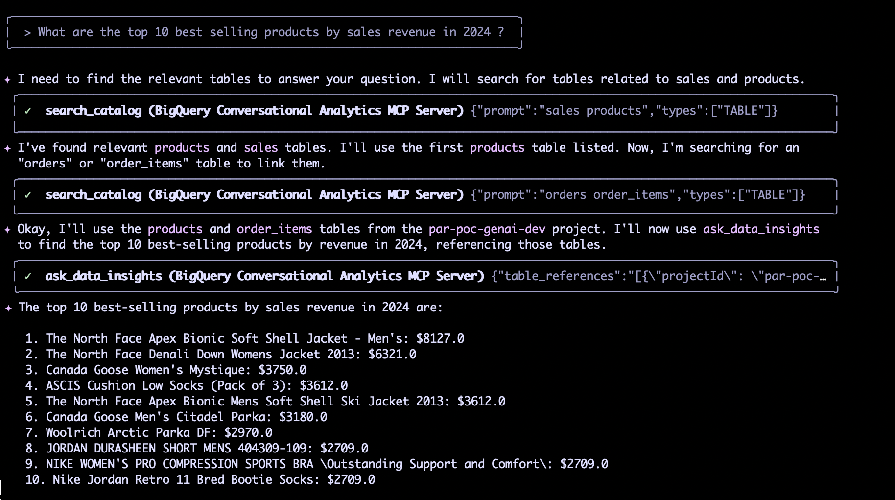 ask_data_insightsen référençant ces tables pour calculer et lister les 10 produits les plus vendus, comme par exemple The North Face Apex Bionic Soft Shell Jacket Men's avec 8127,0 $ de revenus.