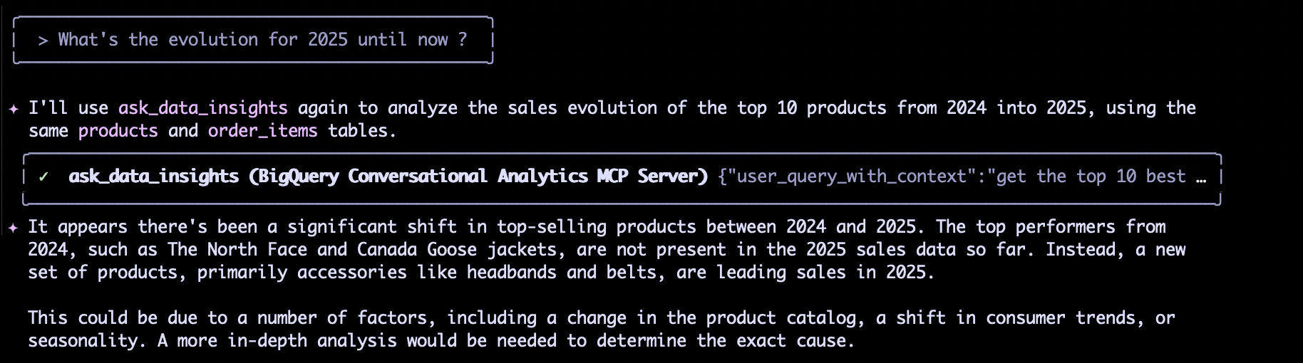 > What's the evolution for 2025 until now ?L'agent a intelligemment utilisé ask_data_insights à nouveau, en appliquant le contexte des mêmes tables de produits et de commandes. L'agent a fourni un insight qualitatif immédiat : un changement significatif s'est produit, les meilleurs vendeurs de 2024 (comme les vestes The North Face) étant absents des données de 2025, remplacés par des accessoires (bandeaux et ceintures). L'agent a même suggéré qu'une analyse plus approfondie serait nécessaire pour déterminer la cause exacte (changement de catalogue, tendances de consommation, ou saisonnalité).