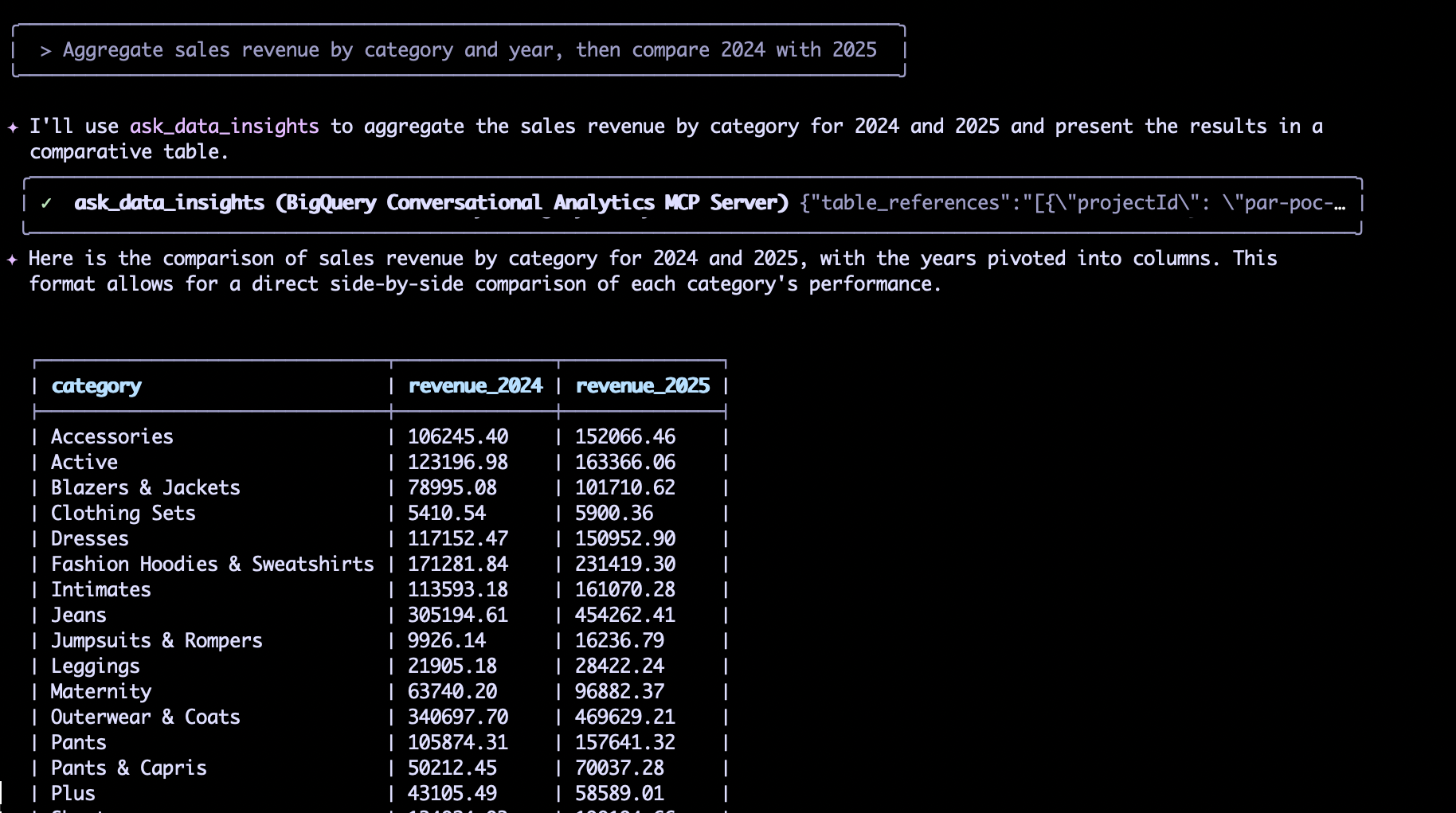 > Aggregate sales revenue by category and year, then compare 2024 with 2025L'agent a utilisé ask_data_insights pour agréger les revenus par catégorie et par an, présentant les résultats dans un tableau comparatif avec les années pivotées en colonnes. Ce format permet une comparaison côte à côte des performances de chaque catégorie. Par exemple, la catégorie "Accessories" est passée de 106 245,40 $ en 2024 à 152 066,46 $ en 2025.