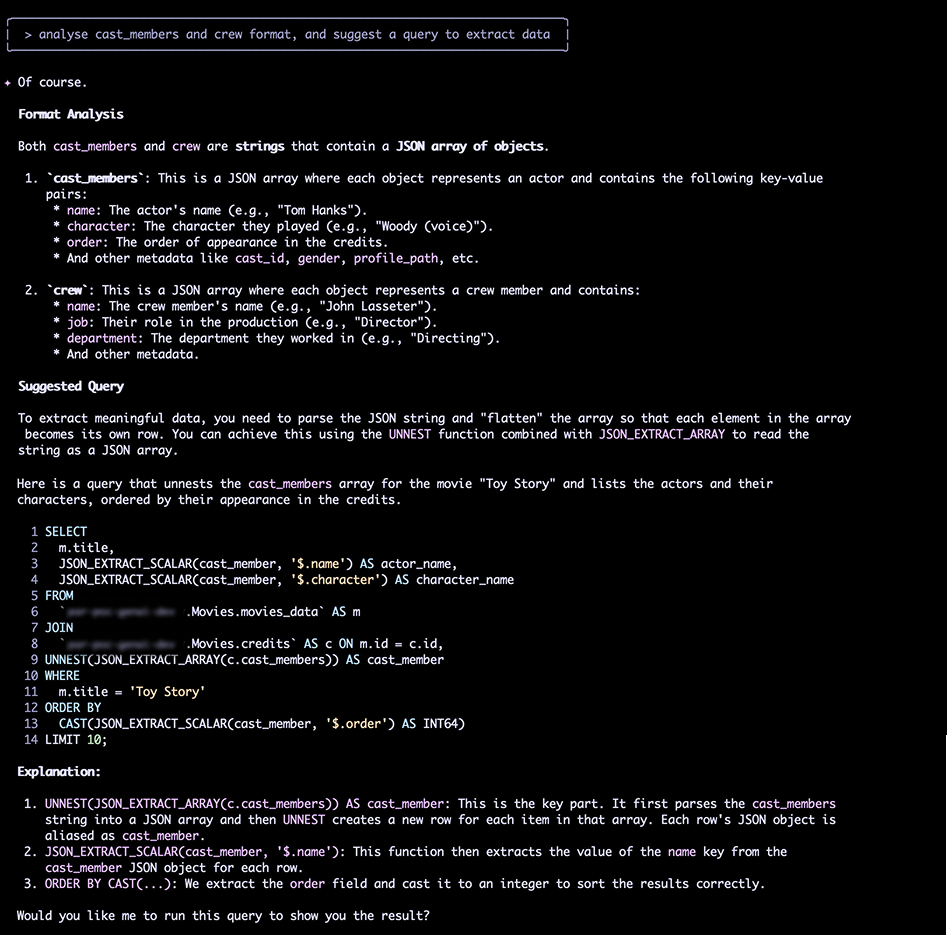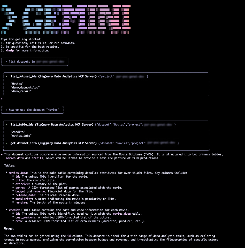 Mon point de départ était un projet BigQuery contenant un dataset "Movies". Une simple commande list datasets m'a permis de le trouver. J'ai ensuite demandé à Gemini comment utiliser ce dataset.