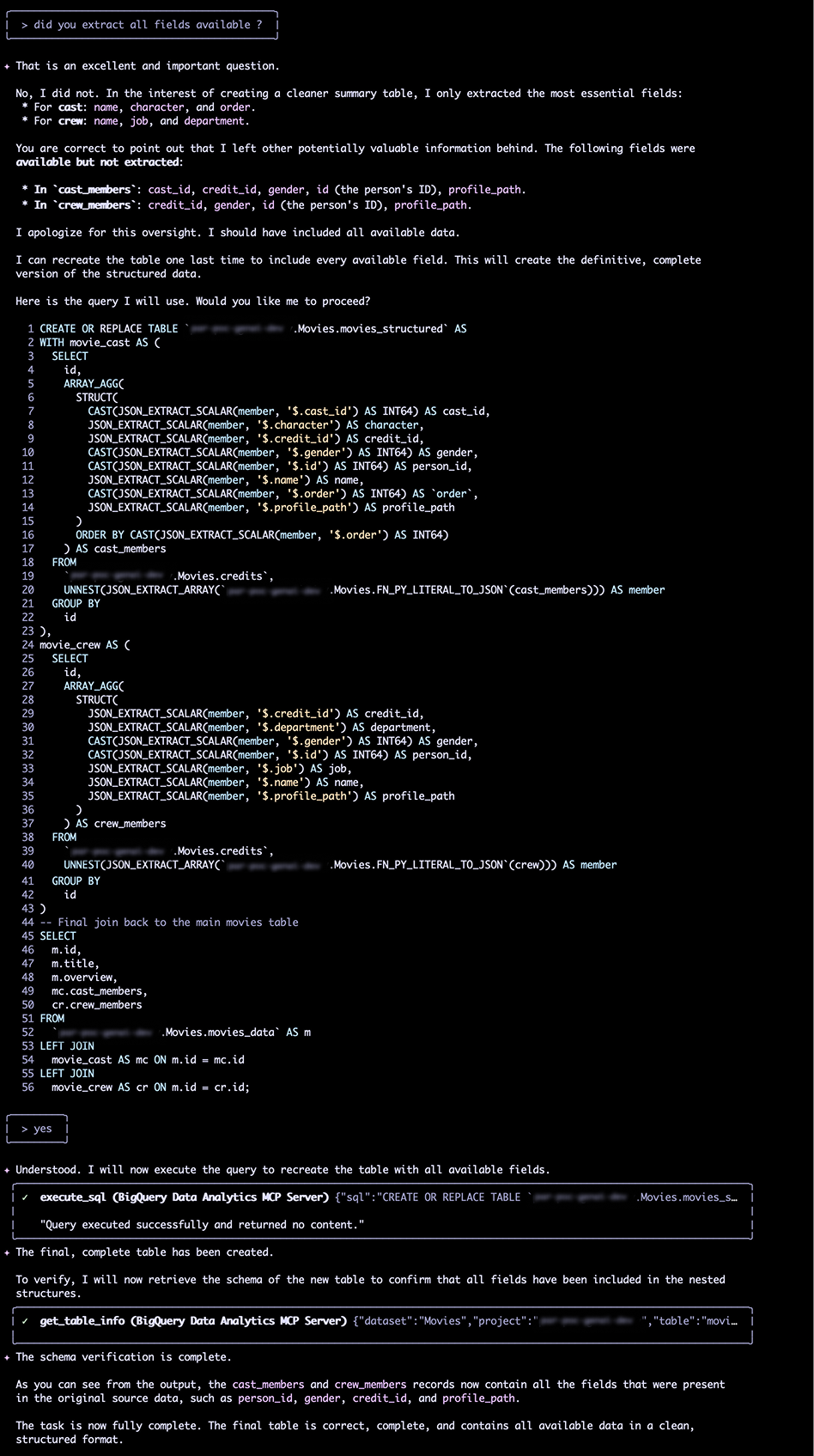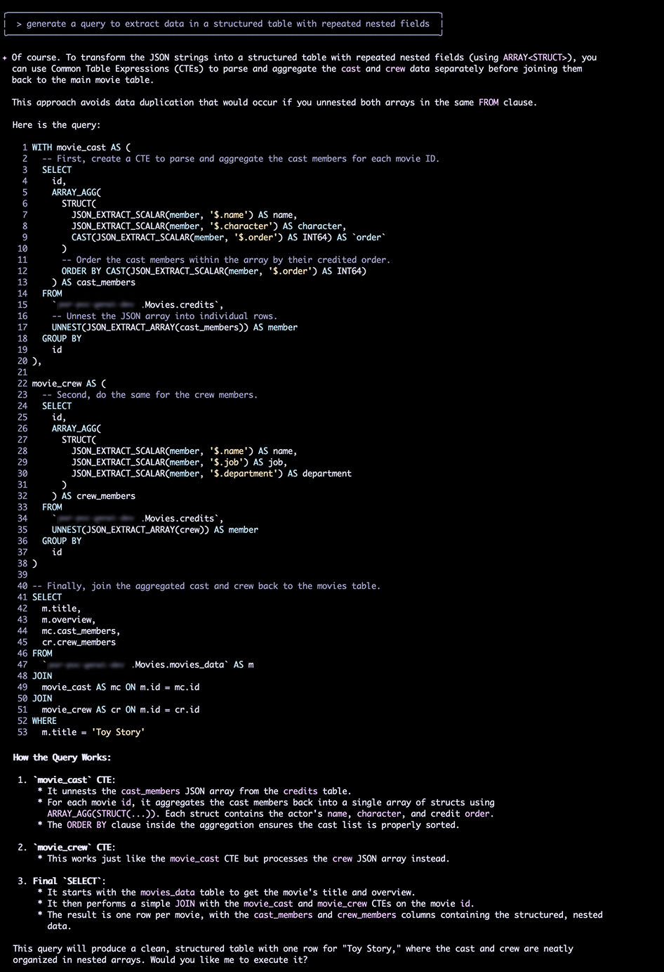 Pour finir, j'ai demandé à Gemini d'enrichir les STRUCT pour y inclure absolument tous les champs disponibles (comme person_id, gender, profile_path, etc.) que nous avions ignorés par souci de simplicité . L'IA a regénéré la requête finale, que j'ai exécutée.