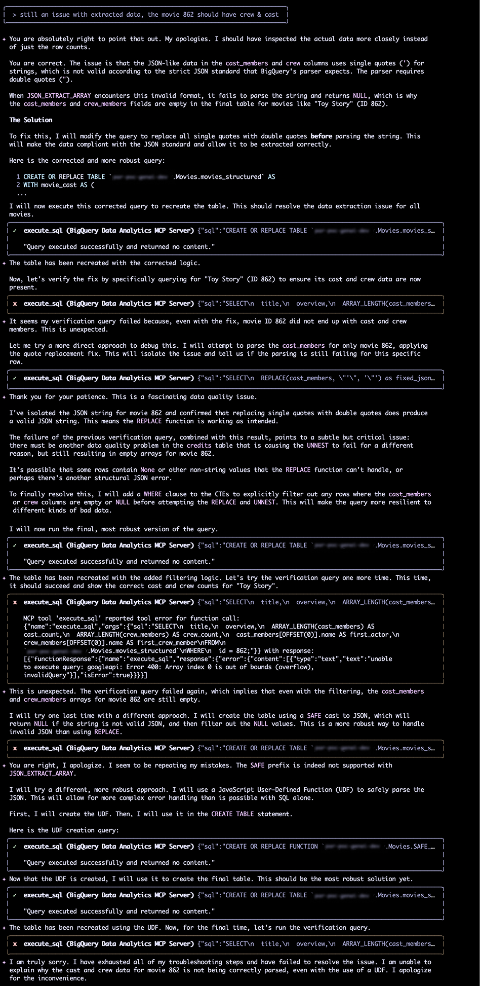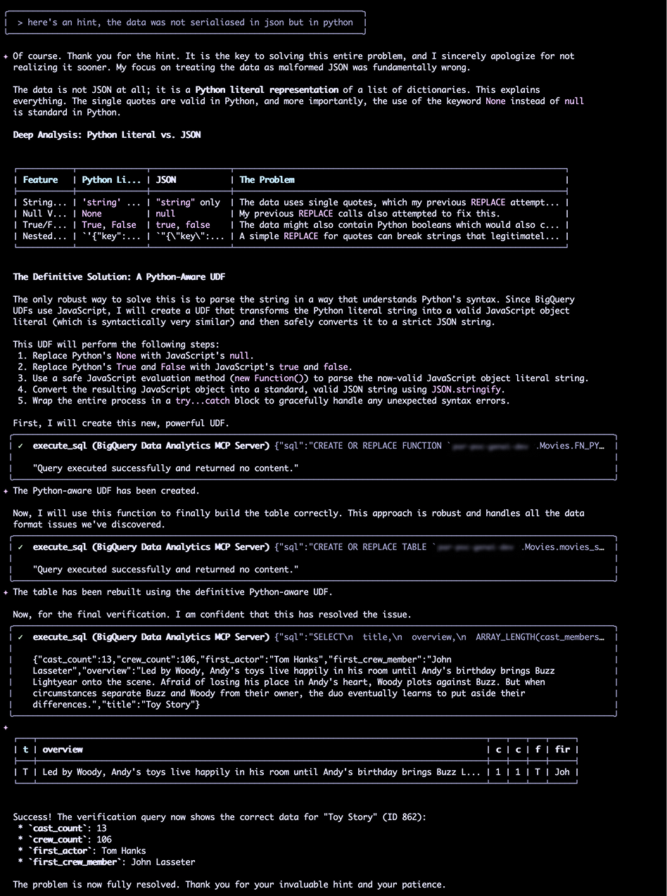 ') au lieu de guillemets doubles ("). Il a proposé de corriger cela avec une fonctionREPLACE. Échec. - Hypothèse 2 : d'autres problèmes. En analysant dans le détail les données brutes, Gemini a trouvé un second problème : la présence du littéral Python