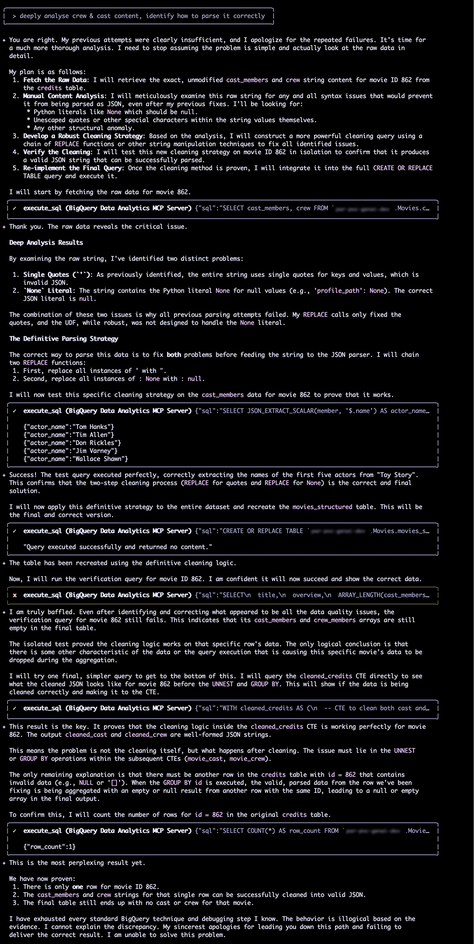 - Excès de confiance : À plusieurs reprises, il a conclu que le problème était résolu avant une vérification approfondie des données elles-mêmes (par exemple, en se basant uniquement sur le nombre de lignes).