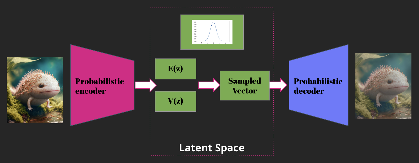Pour contrer ce problème, un nouveau modèle a été créé, le VAE pour - Variational Autoencoders. Comme les modèles Autoencoder, le but est de réduire la représentation des images dans un espace latent de plus faible dimension. La grande différence est que l’encodeur transforme l'entrée en une distribution de probabilité dans l'espace latent, qui représente la variation des données d'entrée. Cette distribution est généralement choisie pour être gaussienne, ce qui facilite l'apprentissage. Le décodeur prend ensuite la distribution latente et génère une sortie qui ressemble à l'entrée d'origine.