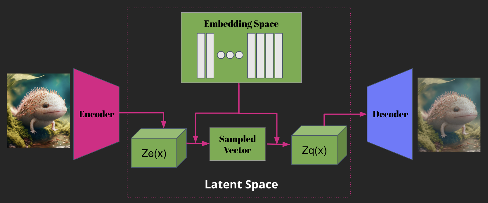 Afin de continuer à améliorer cette approche, un nouveau modèle nommé VQ-VAE (Vector Quantized Variational Autoencoder) a été développé. Cette approche étend les modèles VAE en intégrant une méthode de quantification vectorielle, ce qui permet d'améliorer la qualité de la représentation latente. Les modèles VQ-VAE sont composés d'un encodeur, un quantizeur et un décodeur. Tout comme les modèles VAE, l'encodeur transforme l'entrée en une représentation latente, mais au lieu de produire une distribution de probabilité, il produit un code quantifié. Ce code est ensuite utilisé par le décodeur pour produire une sortie. L’idée est double dans ces modèles : arriver à discrétiser la représentation d’une image et apprendre la fonction de distribution.