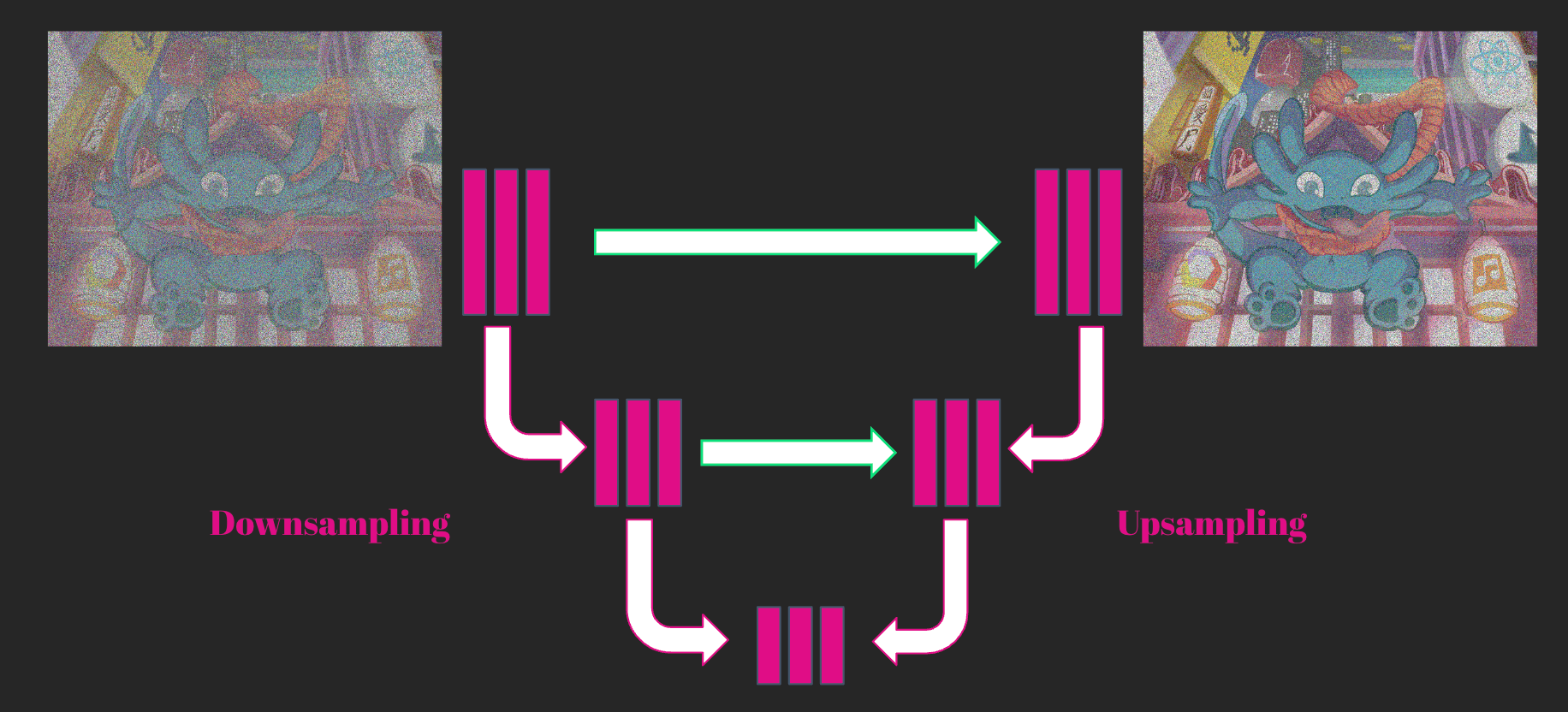 Et l’image ? À partir d’un prompt, une image est générée de manière itérative à partir du bruit. À chaque pas, en utilisant U-NET (un petit devoir à la maison, je vous laisse deviner d’où vient U 😉 ), on essaye de prédire tout le bruit à retirer de l’image actuelle pour obtenir l’image finale. Le modèle reste toutefois prudent, et retire à chaque fois qu’une partie du bruit avant de réévaluer la situation. Quant au prompt, il est encodé et ajouté de deux manières : concaténé à l’entrée avec l’image, ainsi qu'à chaque étape de U-NET à l’aide de cross-attention.