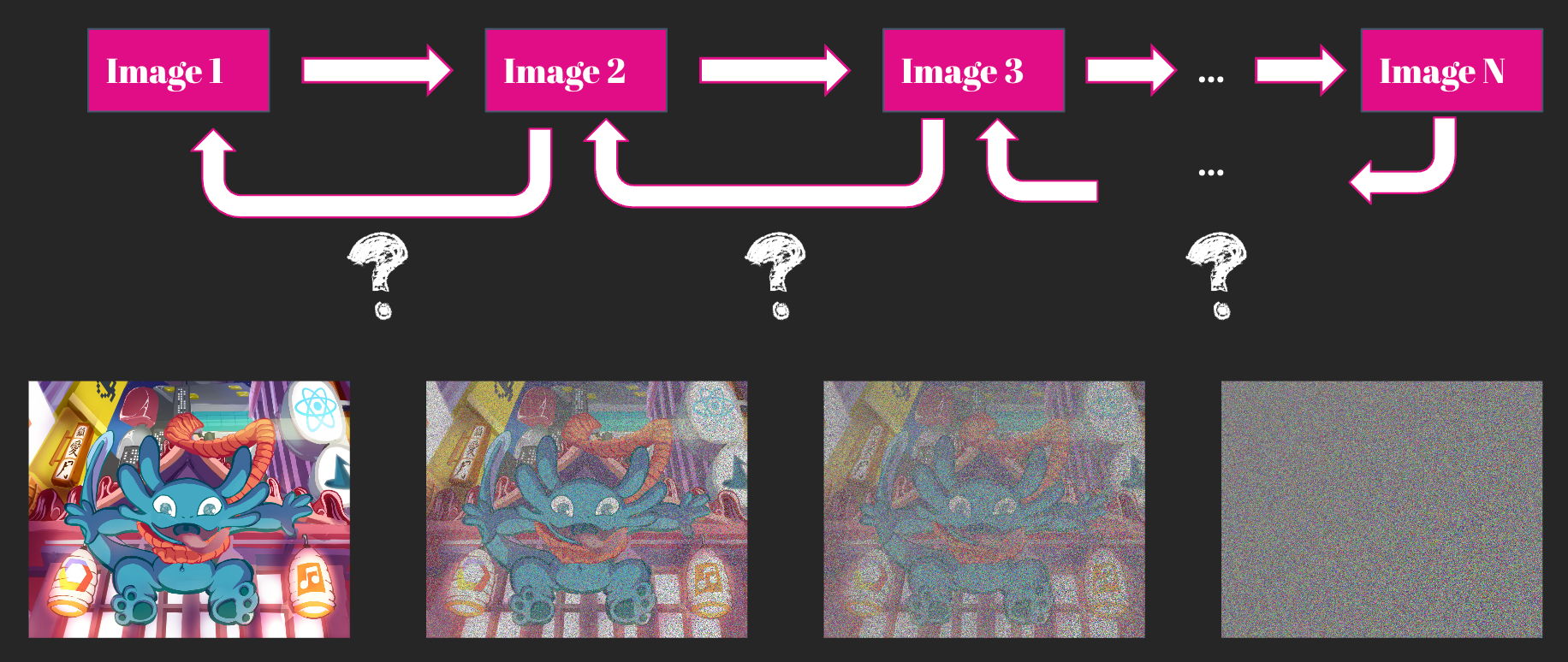 Les Diffusion models, qui ont leurs origines dans la physique, présentent à première vue des similitudes avec les GANs dans la mesure où ils génèrent des images à partir du bruit. Ce modèle introduit progressivement du bruit Gaussien, et en théorie, si l'on effectuait un nombre infini d'étapes, on obtiendrait en sortie du bruit parfait. Cependant, en informatique, l'infini est un peu long et les ingénieurs sont souvent impatients, donc on se limite généralement à environ 100-150 étapes.