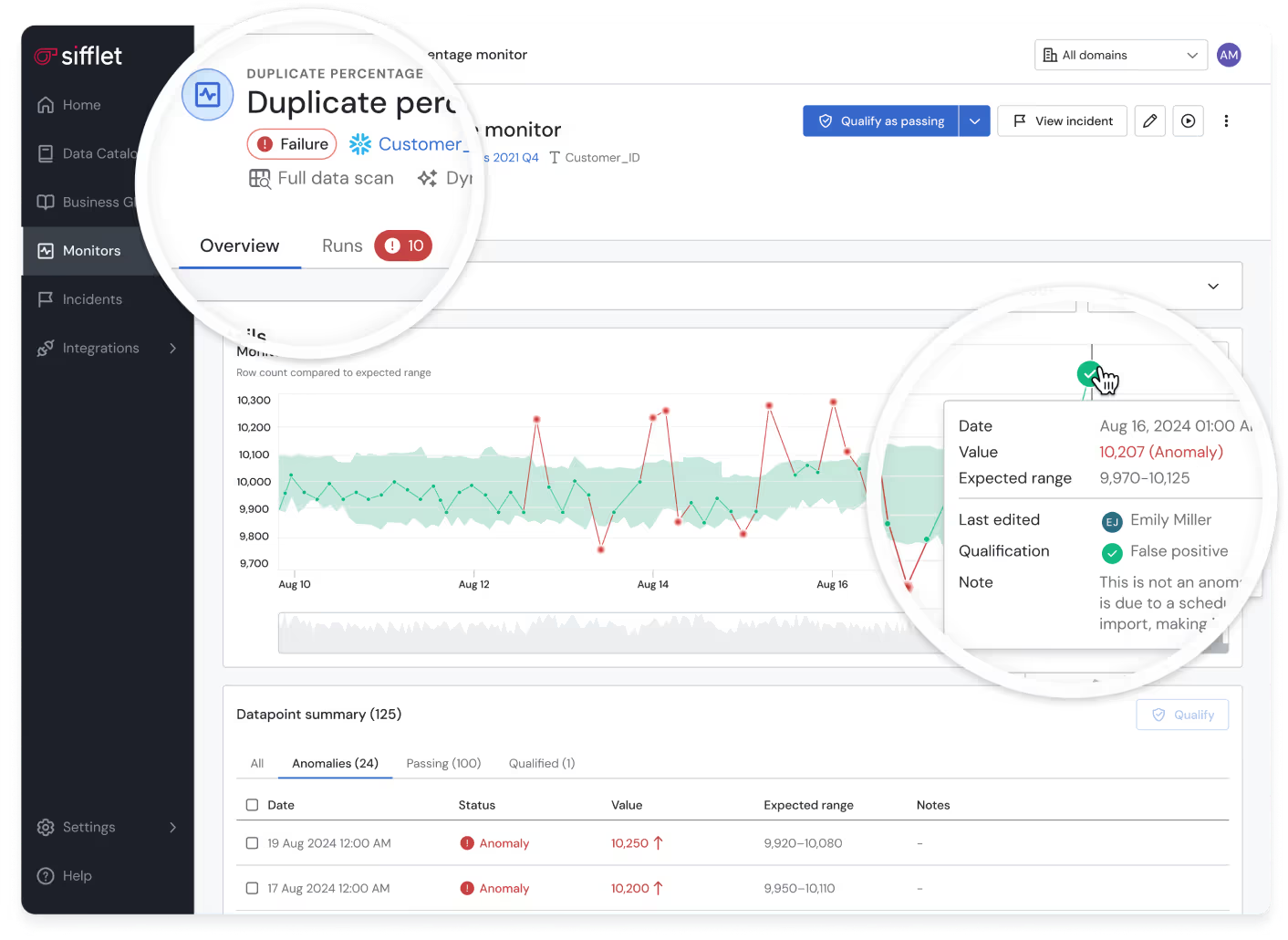La démonstration de Sifflet, réalisée par Shams Roumili, lors de cet événement a parfaitement illustré comment les solutions modernes d'observabilité répondent aux défis identifiés par Carrefour et Saint-Gobain. Cette plateforme française 🇫🇷 se positionne comme une solution centralisée qui unifie producteurs et consommateurs de données, profils métiers et techniques, répondant directement aux enjeux organisationnels soulevés par les intervenants. L'approche de Sifflet s'articule autour de plusieurs innovations clés.