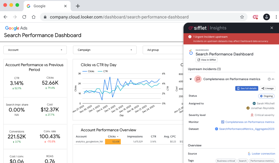 1️⃣ L'extension, dédiée au dashboard (Power BI, Google Ads, Qlick,..), permet de visualiser immédiatement le statut des alertes. Cette approche évite la création de nouveaux silos et facilite l'adoption par les utilisateurs finaux, répondant ainsi à la recommandation de Maxime de ne pas "laisser les business users seuls avec l'outil".