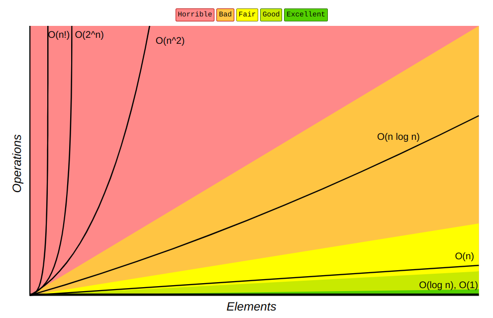 Le graphique ci-dessus montre le comportement des différentes complexités en fonction du nombre d'éléments en entrée. Il met en évidence l'efficacité des algorithmes à complexité logarithmique ou linéaire pour de grandes entrées, tandis que les complexités quadratique, exponentielle et factorielle deviennent rapidement impraticables à mesure que le nombre d'éléments augmente.