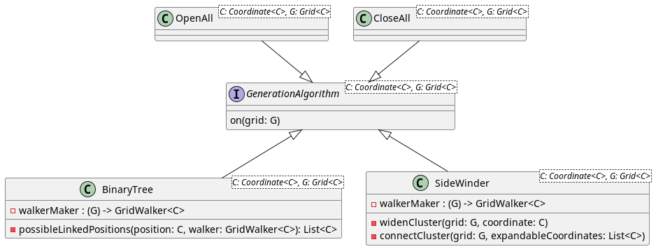 Nous avons pour le moment un total de quatre algorithmes de génération de labyrinthes. BinaryTree et SideWinder qui ont été explorés intensivement dans l'article précédent, OpenAll qui ajoute des liens entre toutes les coordonnées adjacentes et CloseAll qui laisse la grille totalement fermée. Ces deux derniers algorithmes peuvent se révéler utiles à des fins de debugging.
