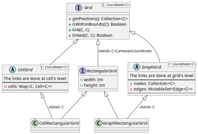 Les classes abstraites CellGrid et GraphGrid ne fixent pas le type de coordonnée à utiliser et proposent les implémentations alternatives en cellules ou en graphe. Elles sont ensuite spécialisées par le type de coordonnée souhaité. Dans le cas des grilles rectangulaires, tout le code est refactoré dans l'interface RectangularGrid. Les classes CellRectangularGrid et GraphRectangularGrid ne contiennent que de l'héritage et un constructeur.